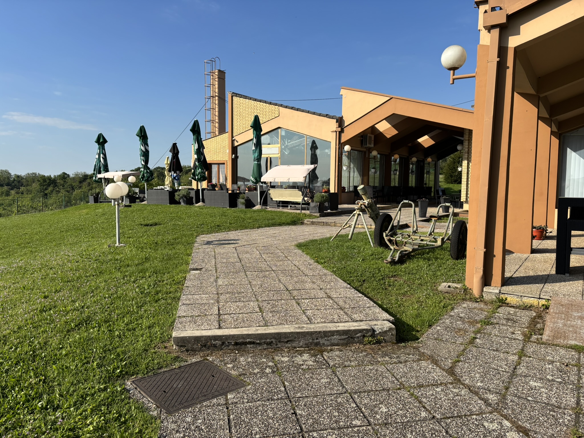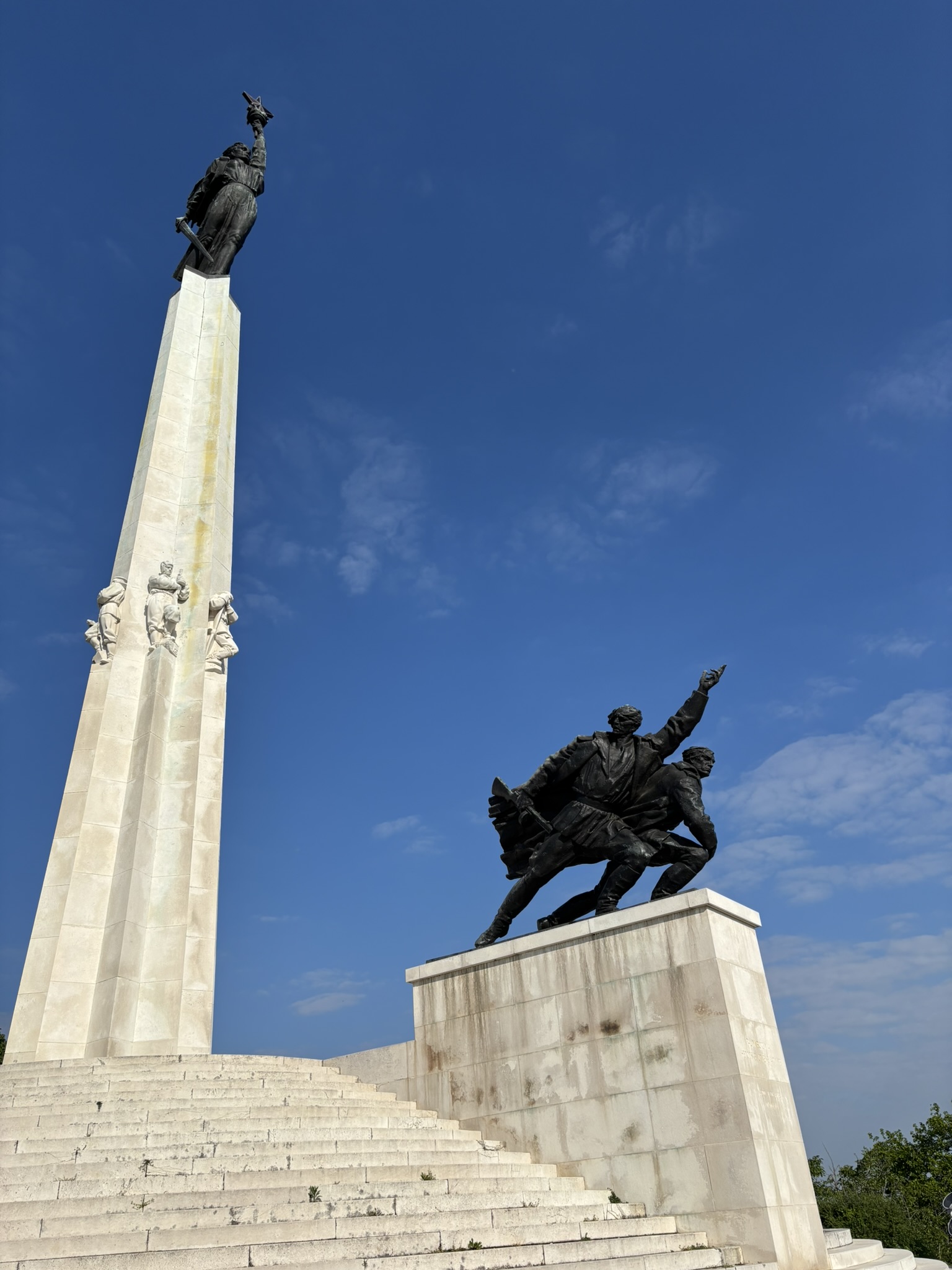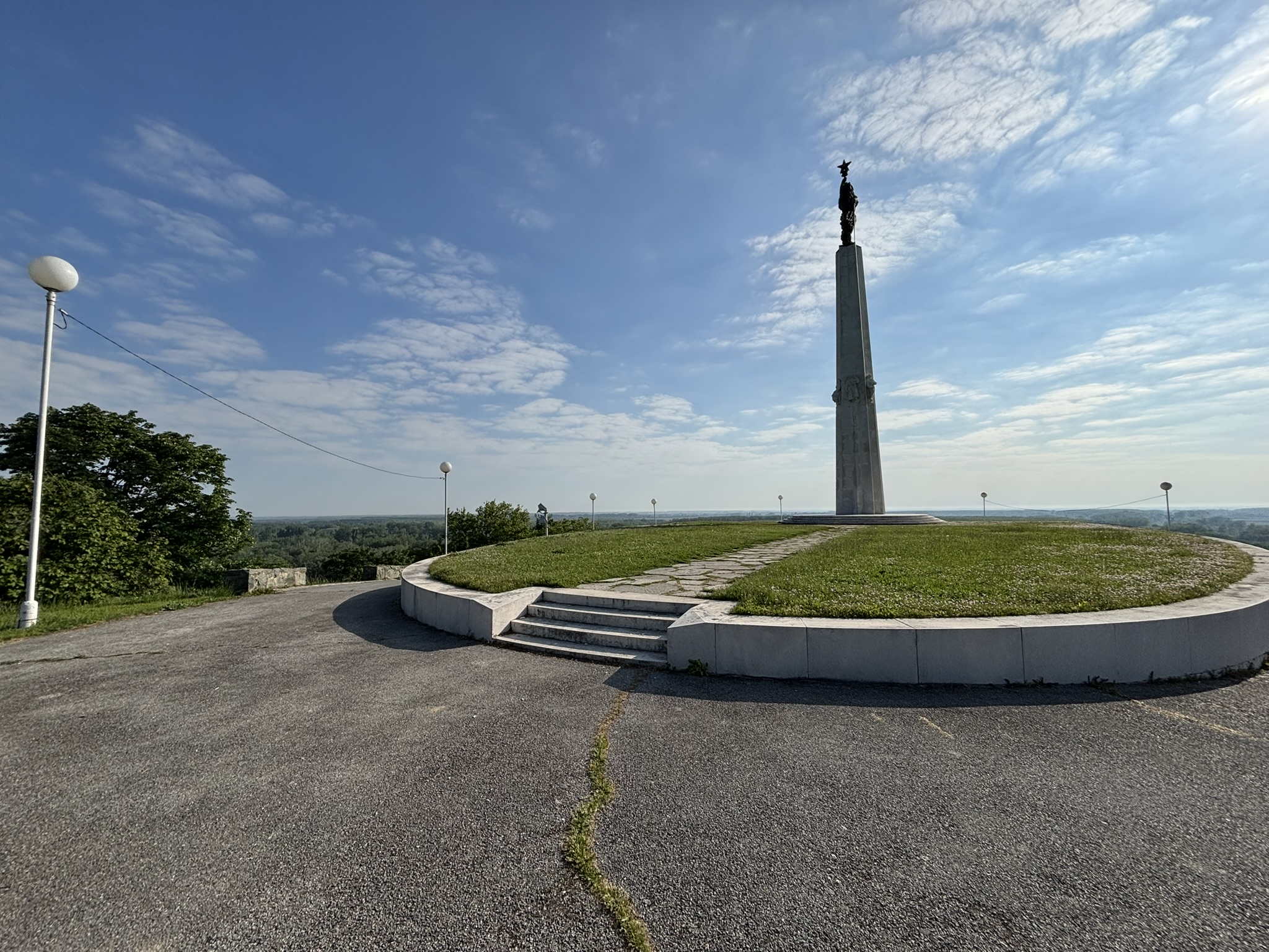 Wcześnie rano na szczycie niema nikogo oprócz mnie. Dopiero po chwili szwędania się po okolicy pojawia się pracownik restauracji znajdującej się nieopodal pomnika z zamiarem jej otwarcia. Z ogródka, na którym możemy znaleźć stary sprzęt wojskowy, rozpościera się widok na Dunaj i przejście graniczne na moście.