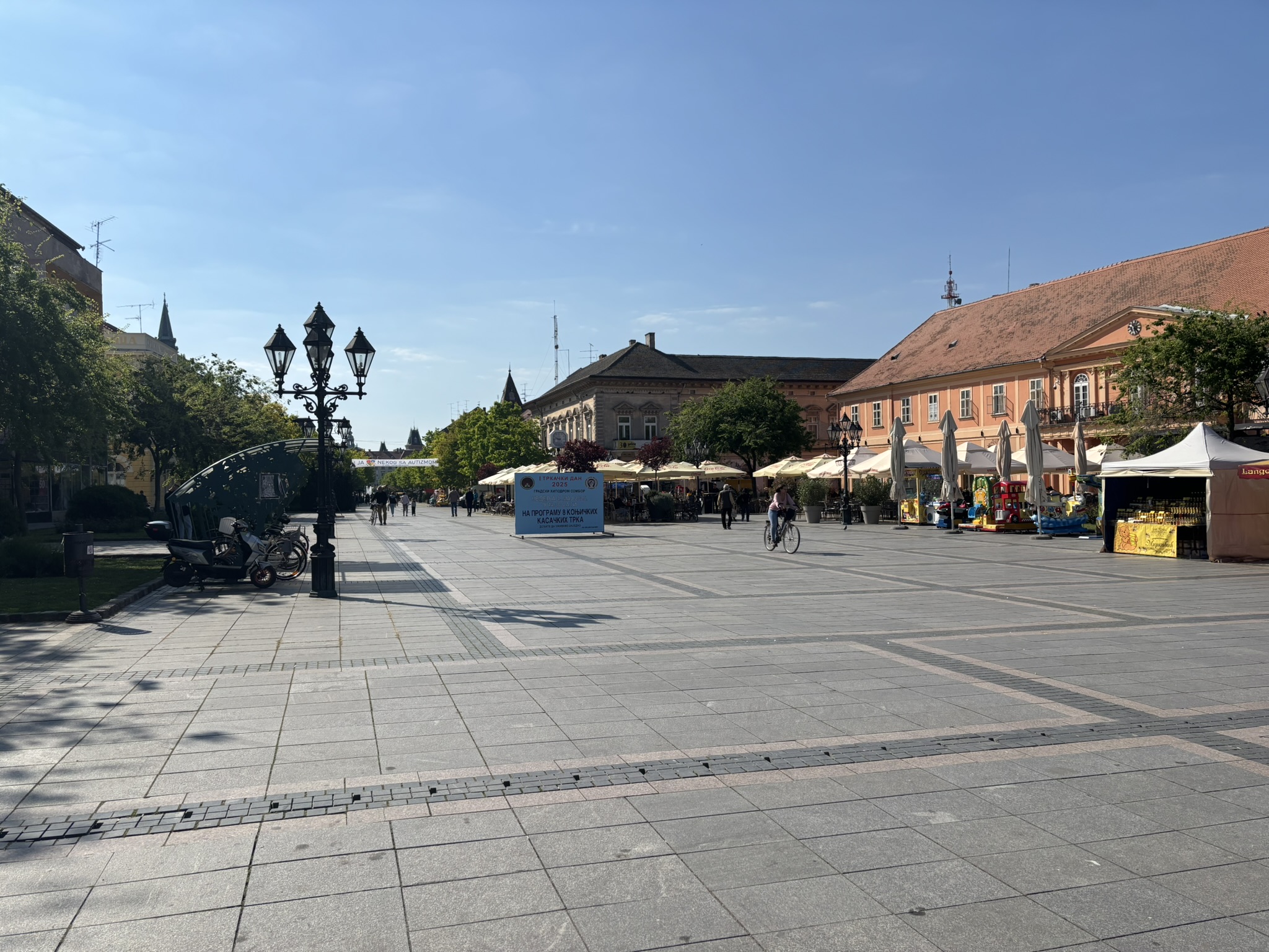 Zostaję wpuszczony. Okręg do którego wjechałem - Wojwodina robi na mnie bardzo pozytywne wrażenie. Drogi są w dobrym stanie, wioski które mijam są zadbane i czyste, choć bardzo skromne. Krajobraz nie zmienił się wiele od chorwackiego ale tablice napisane w dwóch alfabetach, w tym cyrylicą, przypominają, że jestem już w innym kraju. Planuję odwiedzić miasto Sombor, które ponoć słynie z pięknej architektury na rynku, na którym chcę poszukać jakichś lokalnych specjałów - najpewniej rakiji albo wina. W Somborze czuję się jakbym przeniósł się w czasie jakies piętnaście czy dwadzieścia lat wstecz. Nie znajduję żadnych sieciowych supermarketów, jedynie lokalne sklepy spożywcze, masarnie, czy sklepy alkoholowe, niemalże jak w Polsce jeszcze wiele lat temu. Po angielsku się tutaj chyba nie da za bardzo porozumieć, rosyjskiego nie znam, zostaje więc sprawdzić na ile polski jest kompatybilny z serbskim. Okazuje się że da się jakoś dogadać. Na rynku, na stoisku z jak myślałem lokalnymi wyrobami, a faktycznie pochodzącymi z okolic granicy z Kosowem, decyduję się na wino owocowe. Oczywiście gótówki też nie miałem przy sobie, więc musiałem zrobić szybką wycieczkę do bankomatu po dinary, gdzie zapłaciłem solidną prowizję z okazji wypłaty. Niestety serbska waluta nie jest tak łatwo dostępna w kantorach w Krakowie. Po krótkiej rundce po rynku w akompaniamencie akordeonu ulicznego grajka przyszedł czas ruszać dalej.